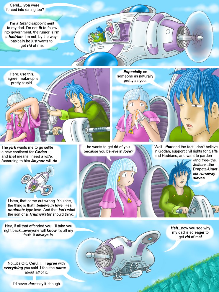 PAGE FOOTNOTES: Cerul Morado is of course the son of Roxo Morado, the Minister Of Science And Technology, one of the three members of the Ministerial Triumvirate Of Pastel. This means that Cerul is basically the son of what amounts to a president or prime minister, only mixed with the social impact of a Catholic pope (at least as far as Catholics are concerned, anyway). The power of the Triumvirate is absolute in the way that absolute dictators have power, the power of kings. So, it is quite a very big deal that a girl from a low, poor, and utterly unimportant family is thrown together with him on a date.