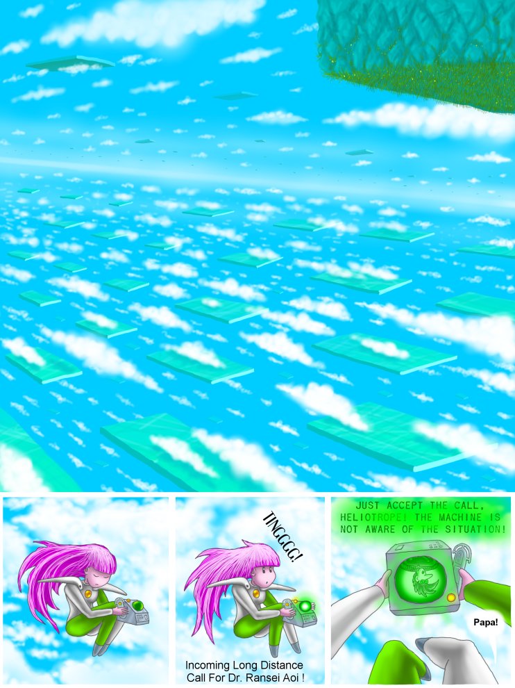 Now normally, the Linea is not visible to the naked eye, as it is diffused throughout the dense atmospheric void, but it can be detected with sensitive instruments, and however it is that the animated construct that is Heliotrope percieves the world, her superior capacities are decidedly up to the task of viewing the Linea. Thus, we are seeing things in this page in 'Helio-Vision' as it were.