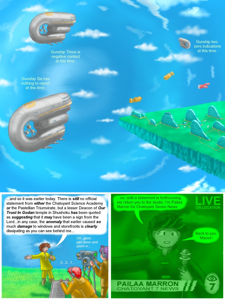 PAGE FOOTNOTES: Where do ideas come from? I'll tell you. Cool Gunships, right? I was sitting on the toilet, twisting a clean piece of toilet paper in my hands into knots. I was feeling nervous over the big migraine I had the night before. I dropped the wad of twisted paper on the rug and when I looked down to pick it up, it looked amazingly like the gunships in today's painting. I carefully lifted the paper and carried it to my computer, and used it as a drawing model, as inspiration.