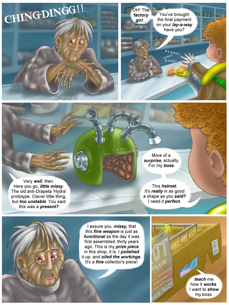 PAGE FOOTNOTES:  The CX-01 "Hydra" Crimson Attack Helmet was developed after anecdotal reports of runaway Jellese slave colonies were verified. The concept behind such an odd weapon was to provide a virtually hands-free single or multiple target crowd extermination device. The side roundels can be twisted open to allow access to the inner workings, which involve easy-to-load slots for raw Chatoyanite to be inserted. Green and Orange Chatoyanite are used to control and power the mechanisms of the helmet. The weapon was designed to be used with raw Chatoyanite, because it was created to be capable of being field-stripped and reloaded using available resources in almost any situation, including unsettled continents.