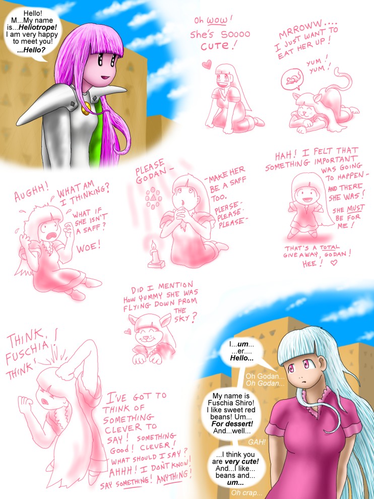 In the context of Fuschia being utterly bowled over by her emotions, in total awe of her new object of love, going on about beans seems positively sensible to me at this point, and I had great fun depicting the thoughts and feelings swirling in her mind as she struggles to find something to say. In order to try to give her thoughts a feelling of spontaneity, I put myself into her mind as best I could and then just drew her thoughts as quickly as I could with no planning or concern.