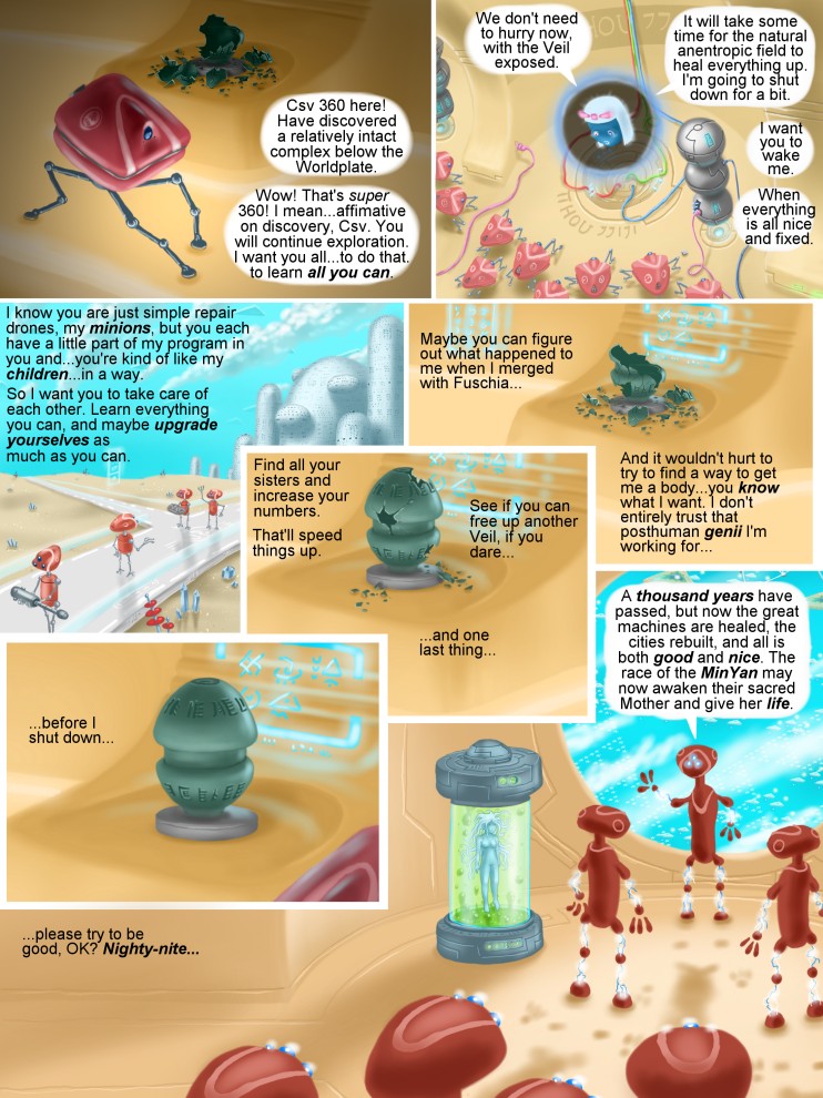 PAGE FOOTNOTES: It's surprisingly tough to choose a good name for a page, sometimes. I went through 'Mother's Day', briefly considered 'All My Children', passed on 'Darwin In Steel', although I thought it was pretty good... and even considered pretentious titles like 'Mechanus Darwinia'. Ecch. Finally it hit me that the speech of the head of the High Counsil of the MinYan sounded rather Lovecraftian. The stars were in their place and it was now time to resurrect the Elder God(dess). That's when I settled on The Call of Cthursor. You can't go too far wrong with a Lovecraft reference. I heart Lovecraft.