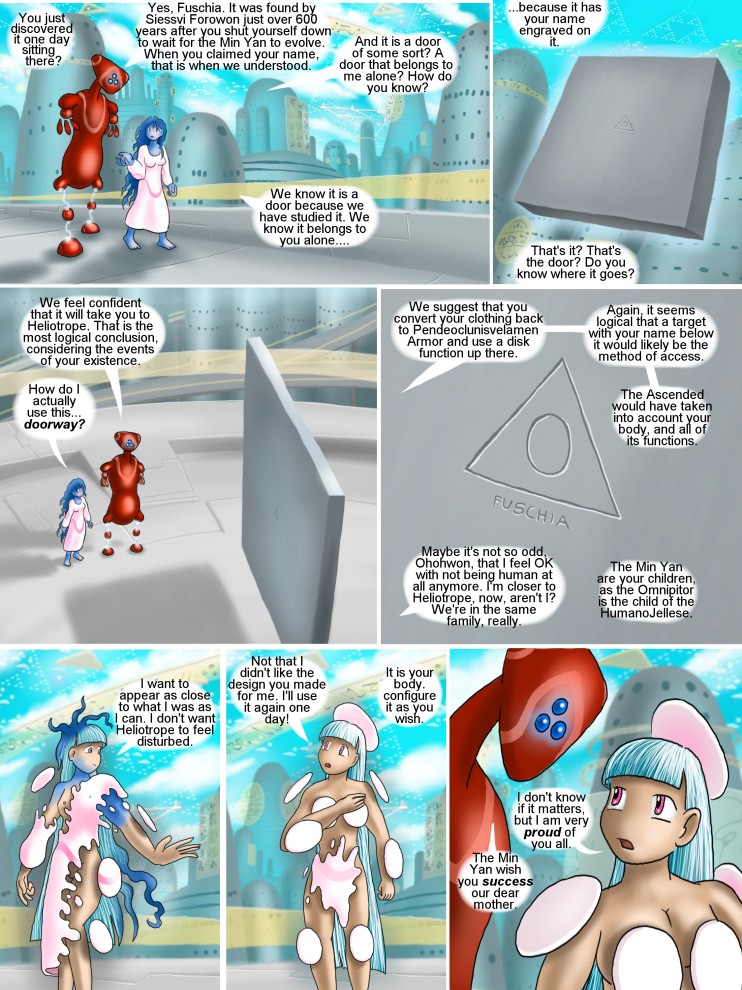 The Pendeo Armor is a natural process of Fuschia's body, and she can express it at will, and in countless forms. The disk form, the 'floaty buttcover' configuration acts as true armor; she could slide down a violent inter-cosmic natural Arc-Duct (not like the peaceful and artificial version that Pastel represents), or dive through the heart of a Mundis star in such garb. She is all but contained in a private cosmos in Pendeo Armor, and using the disk units, can interact with and manipulate things -and information- on a range of scales that while in no way comparible to Helitrope's Omnipitor, are nonetheless all but godlike.
