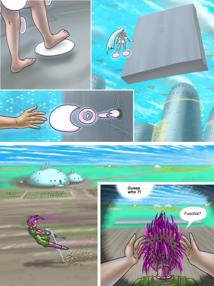 PAGE FOOTNOTES: I hope I made the 'Fuschia's transhuman memory upload' sequence long enough before the temporal recursion punchline. That is always the question; what actually adds to things, and what is just indulgence upon favored characters. Also, how much can I stand before I get bored and need to move things along. That's a factor too.