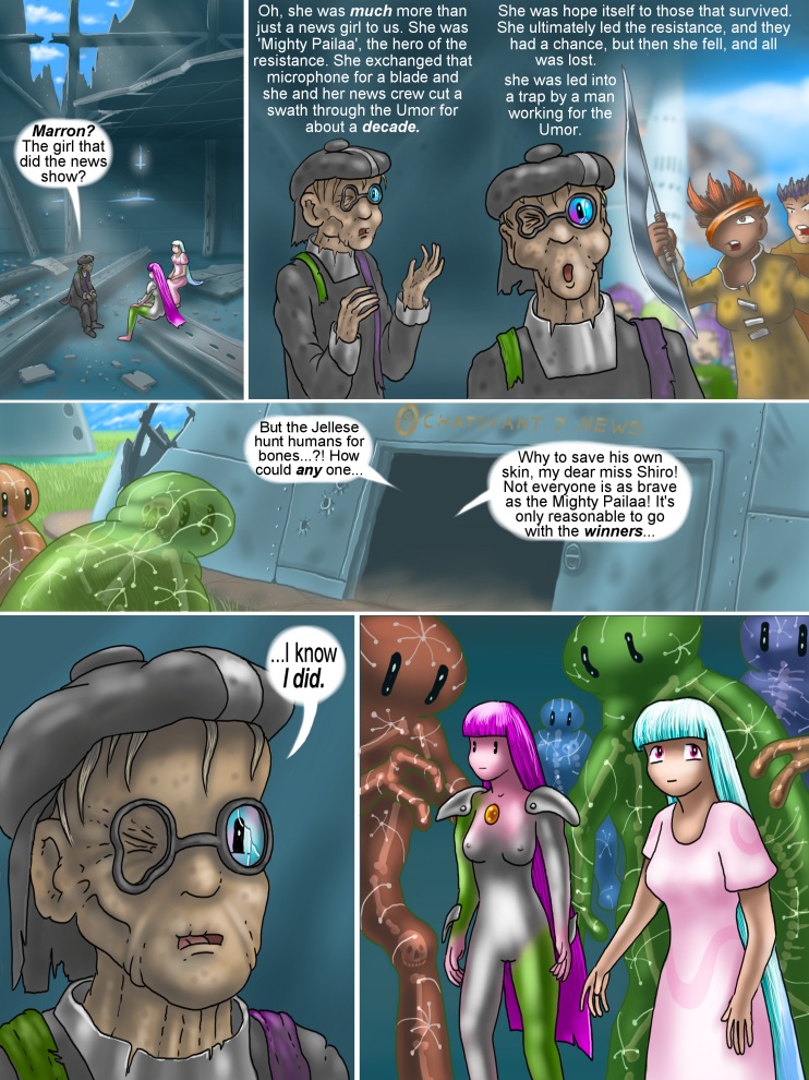 PAGE FOOTNOTES: Somehow, the idea of Pailaa Marron and her news crew leading an underground resistance against the Jellese conquerers really appealed to me. It also fits with her character. And we see a return of the Ark Blade, a nod to Unicorn Jelly.