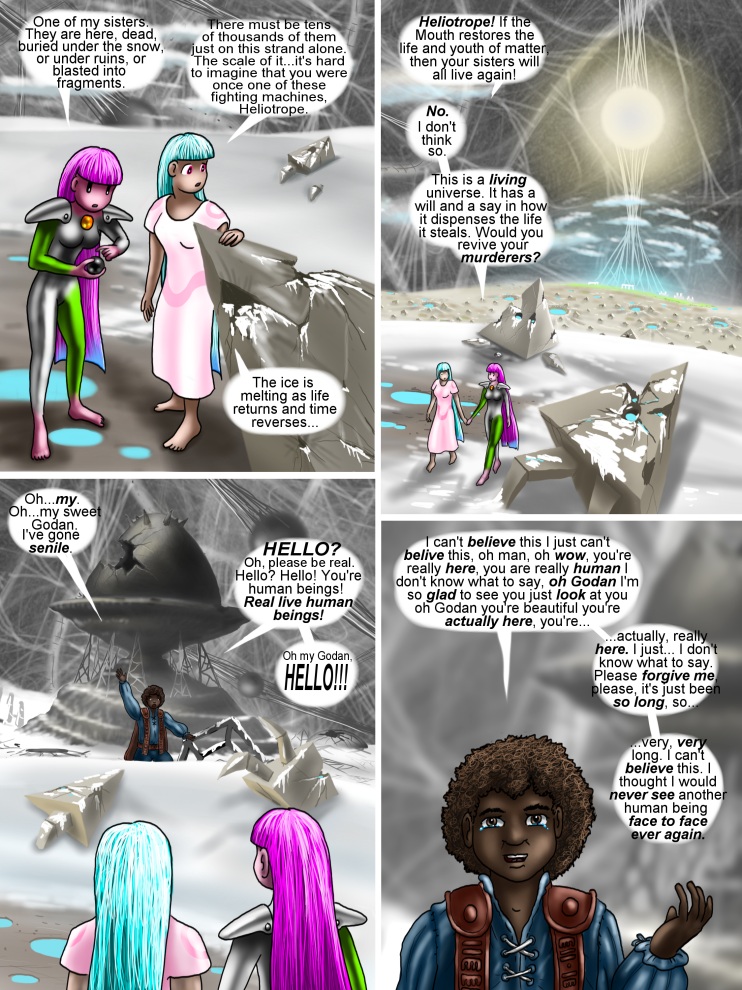 PAGE FOOTNOTES:  I had a lot of trouble coming up with a hair style for our hero with the home-sewed sleeves (and Ktlikitkaktlian leathers). I tried dreadlocks first, because I love dreadlocks, but as cute as it was, it looked slightly silly, especially since I couldn't guarantee to myself that he would have the means to do them correctly, even if he had the time. It was reasonable, considering his circumstances, to give him utterly wild, poorly maintained hair, a veritable mop of dishevelment, but that really didn't fit the character - he'd find some way to trim his hair better than that, especially if he is sewing his own shirts. Finally I settled on a very simple, not overly kept style that seemed reasonable considering both circumstance and character temperament. Trimmed, but not excessively so.