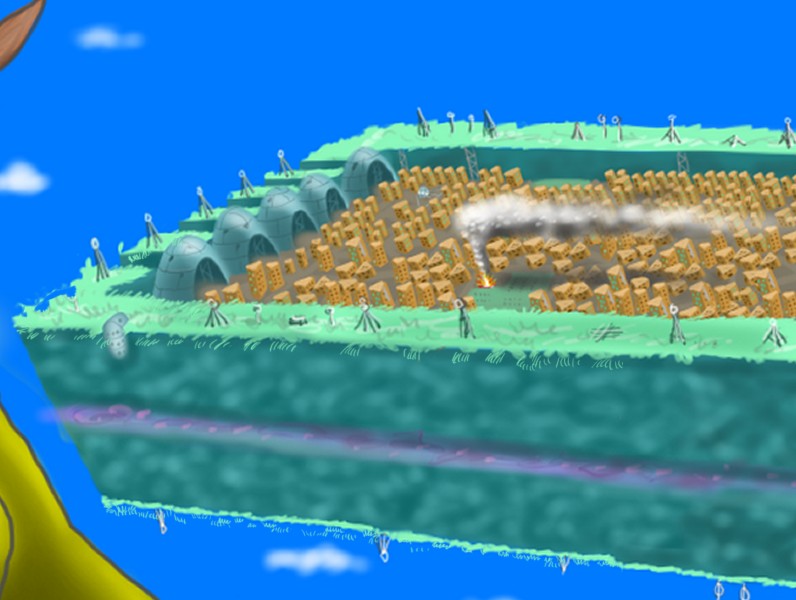 This is, of course, the result of Chatreuse's first use of her Crimson Attack Helmet. Of note in this image, however, are several places we have seen on the Twiland side of Senryoku continent. The shaded side has been severely strip-mined, which is why everything is built within a huge rectangular pit...the mining has left only enough edge to allow the continent to not crumble. The rusting remains of mining equipment line the edges. Below, entirely paved except for the few Twiland Concreton Farms (green areas 'planted' with the huge Concretonic Black slabs used to generate raw Chatoyanite) sprawls a vast city of multistory towers. The towers are protected from the constant winds by the walls of the great mining project, and are built cheaply of brick and stucco, unlike the shining fin-shaped buildings of Shushoku.