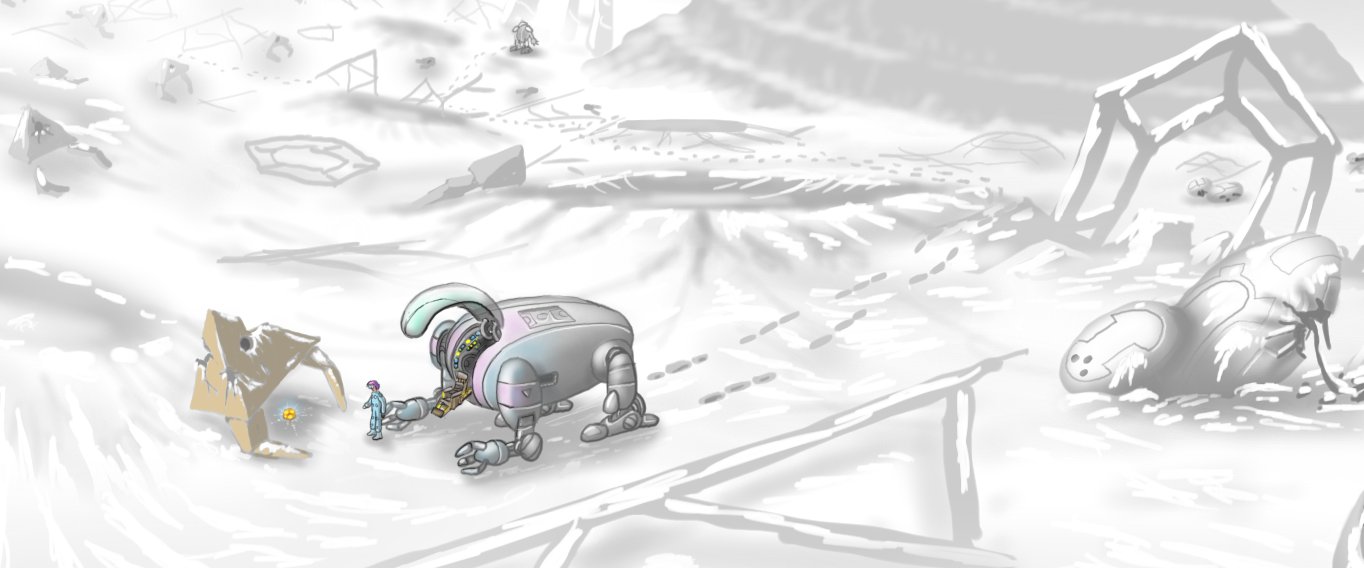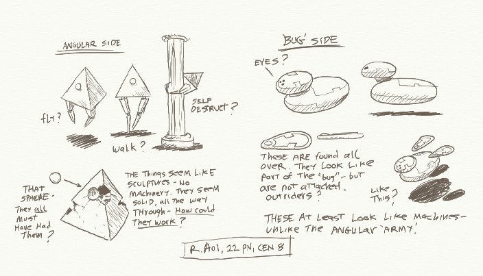The angular, pyramidal units have articulated leg-like structures hanging below. It is possible that they could walk as well as fly, certainly the rounded opposing 'bugs' must have flown. There is some suggestion, according to Dr. Aoi, that the pyramids may have had a self-destruct capacity; he found exploded columns to which a pair of clamping 'legs' were still attached. The many craters seemed to be created by numerous causes, some seemed melted, others appeared the result of impact or explosion, and some... of utterly unknown causality.