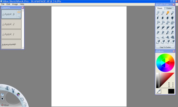 This is a very reduced image of my basic working environment inside of Alias Sketchbook Pro. I use a starting blank page of white which is 2250 X 3000 pixels in size. This size is ideal in several ways: it is the exact dimensions of an 8 X 11 sheet of paper, and is thus perfect for printing out, and it has enough pixels to be worthy of printing to make a nice, professional quality book someday (if such should ever occur).