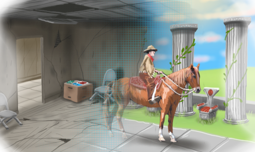 As he went online, Richard's chair gently changed shape under him. He was soon astride a western saddle on his favorite horse, Commodore.