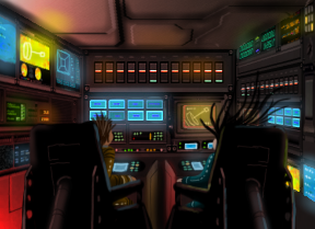 Dirk hopped through the cubic vehicle's hatch and Tala followed. They landed in some kind of cockpit.