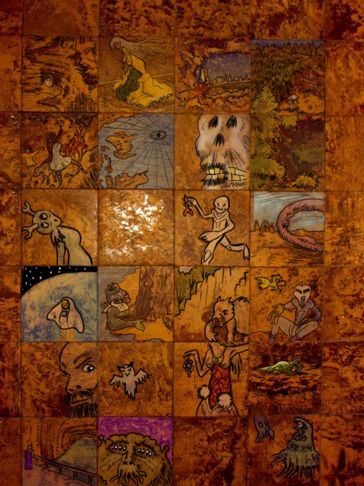 Go is one of my favorite games, and I prefer it to chess. Where chess is a small-scale tactical battle between two opposing armies, Go is a large-scale strategic conflict where every playing piece, or stone, represents a single army. This painting consolidates how I envision the abstract Go board when I formulate my overall strategy within the game. For me, the lines are roads, the intersections are small towns and villages, and the star points are important capital cities with great influence on the surrounding land. The center of the board is the highlands, the edges the seacoast.